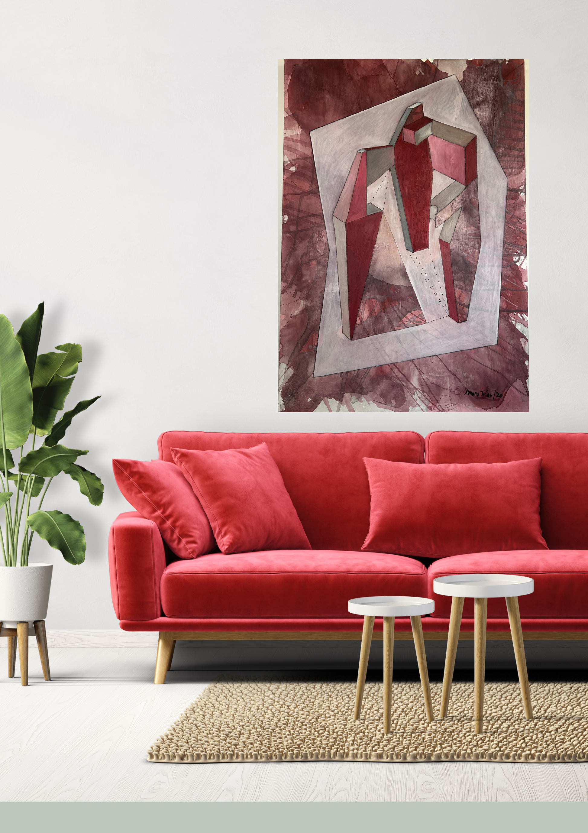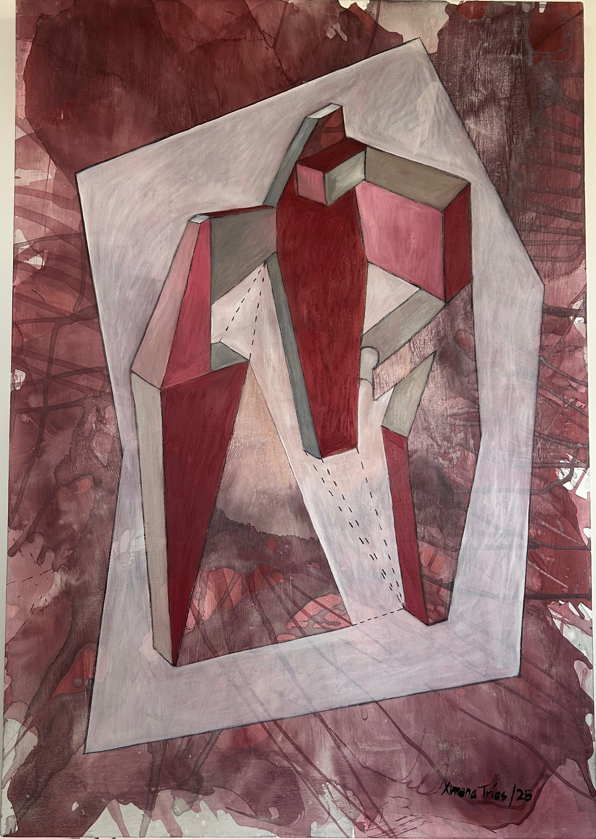 Expreso mi obra mediante geometrías abstractas, estructuras, origamis, laberintos, sin buscar líneas perfectas, al contrario, encontrar la belleza en la línea "imperfecta", representando las fluctuaciones de la vida.