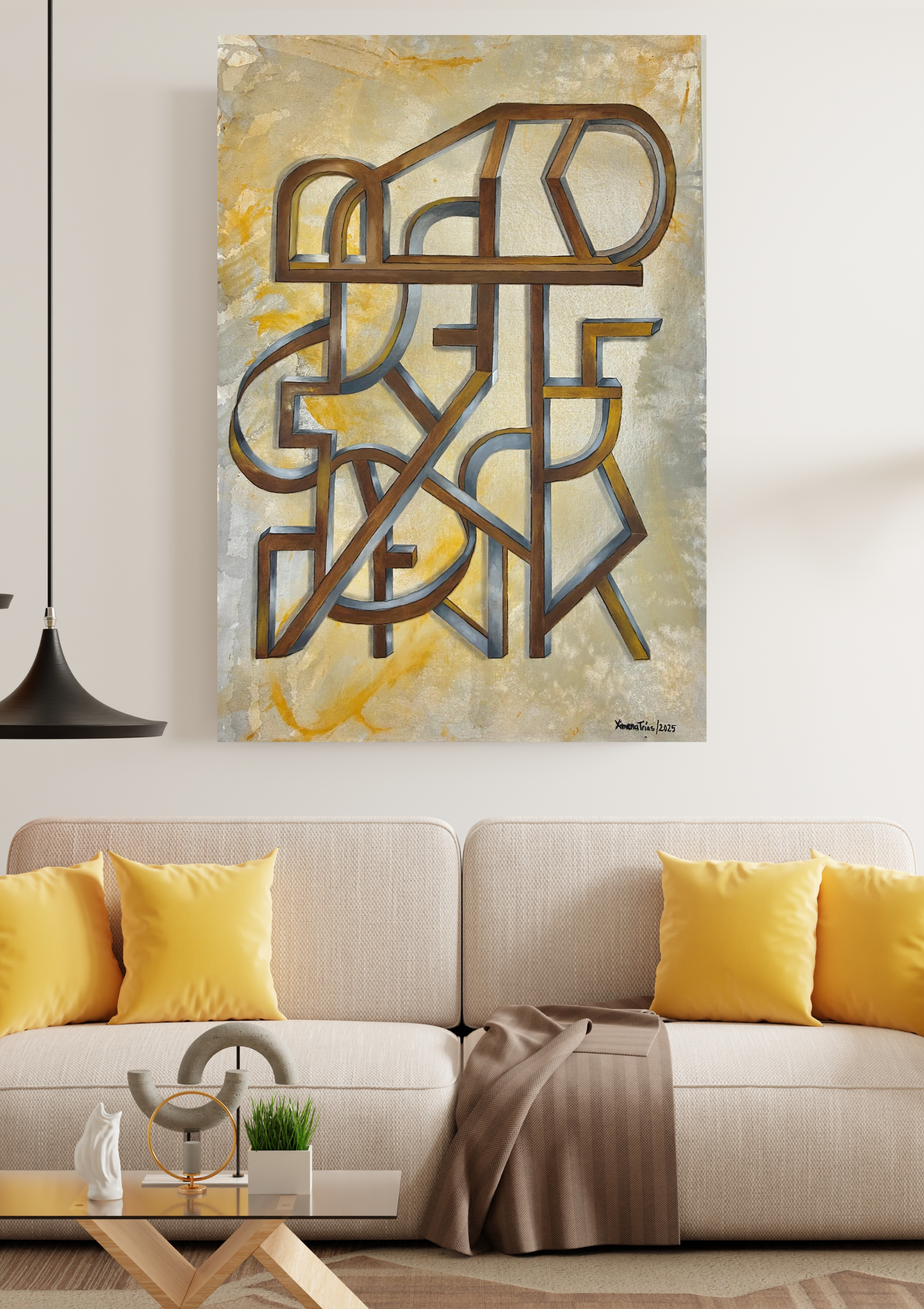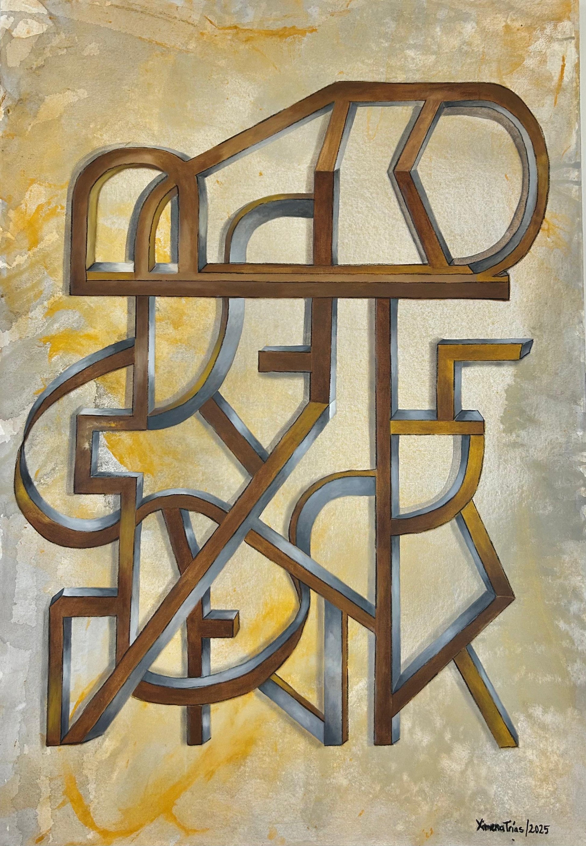 Expreso mi obra mediante geometrías abstractas, estructuras, origamis, laberintos, sin buscar líneas perfectas, al contrario, encontrar la belleza en la línea "imperfecta", representando las fluctuaciones de la vida.